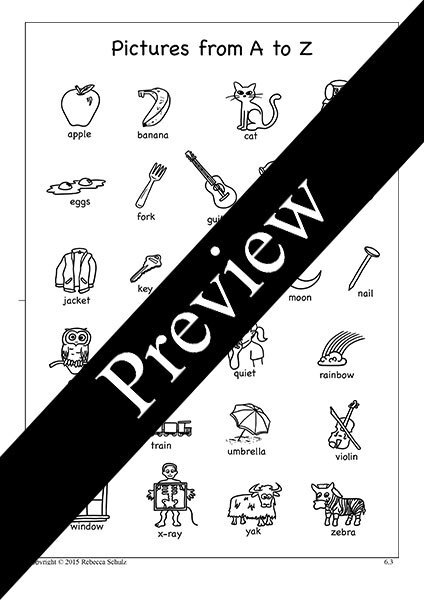 Vocab: apple, banana, cat, doll, eggs, fork, guitar, hammer, ice, jacket, key, lizard, moon, nail, owl, pencil, quiet, rainbow, sun, train, umbrella, violin, window, x-ray, yak, zebra