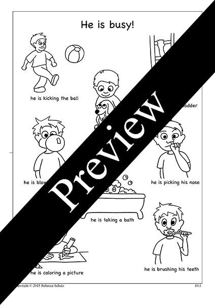 Vocab: blowing a bubble, brushing his teeth, climbing the ladder, coloring the picture, kicking the ball, petting the dog, picking his nose, taking a bath