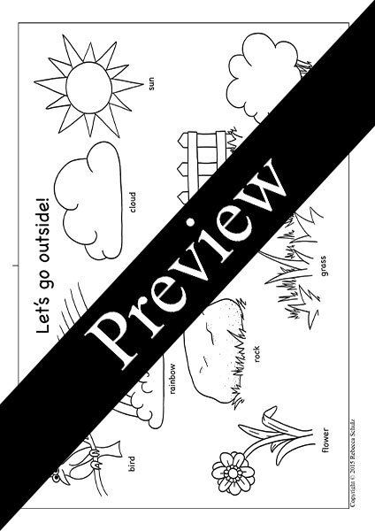 Vocab: bird, cloud, fence, flower, grass, rainbow, rock, sun, bush