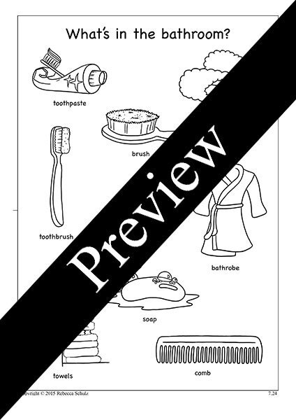 Vocab: bathrobe, brush, comb, mirror, slippers, soap, toothpaste, toothbrush, towels