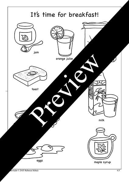 Vocab: bacon, cereal, eggs, jam, maple syrup, milk, orange juice, pancakes, toast