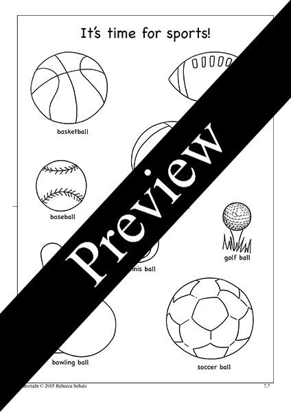 Vocab: baseball, basketball, bowling ball, football, golf ball, soccer ball, tennis ball, volleyball